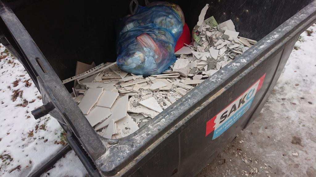 Někdo zřejmě modernizoval koupelnu a zapomněl si objednat kontejner na likvidaci suti. Použil tedy kontejner na směsný odpad na Sklace. Svozová firma samozřejmě takový kontejner nevyveze, neboť likviduje odpad ve spalovně a obkladačky nehoří...