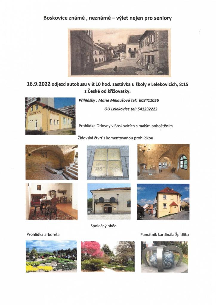 Obec Lelekovice zve v pátek 16.9.2022 na výlet do Boskovic.