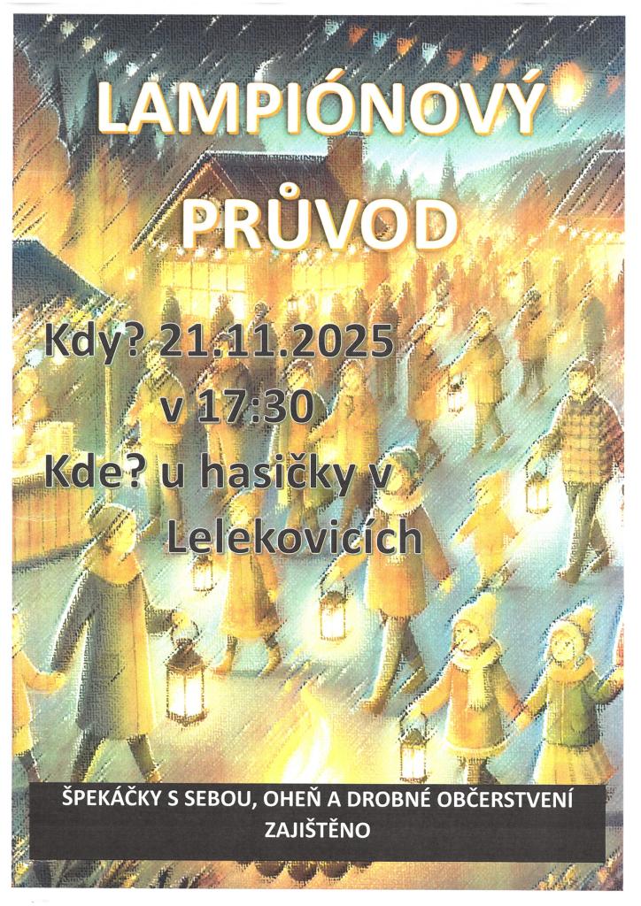 Zveme děti a rodiče na Lampiónový průvod, který se bude konat v pátek 21. 11. 2025 v 17:30 hod., sraz u hasičky v Lelekovicích.