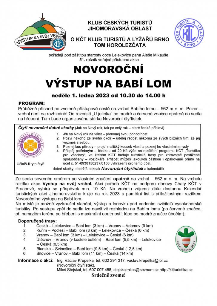Klub českých turistů pořádá 1. 1. 2023 od 10.30 do 14.00 hod. Novoroční výstup na Babí lom ....