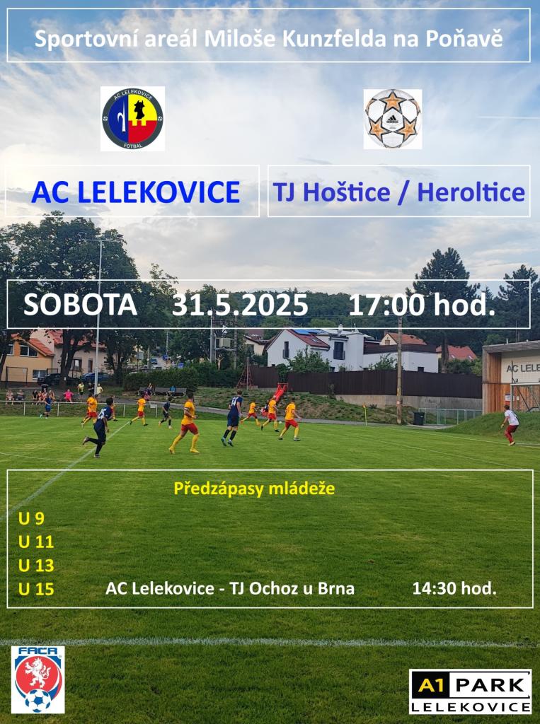 AC Lelekovice zve na sobotní utkání mužů proti TJ Hoštice/Heroltice v 17 hodin. Od 14:30 se představí družstvo U15 v zápase proti TJ Ochoz u Brna.
