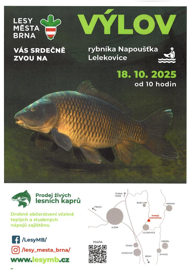 Lesy města Brna zvou v sobotu 18. 10. 2025 od 10 hod. na výlov rybníka Napoušťka v Lelekovicích ....