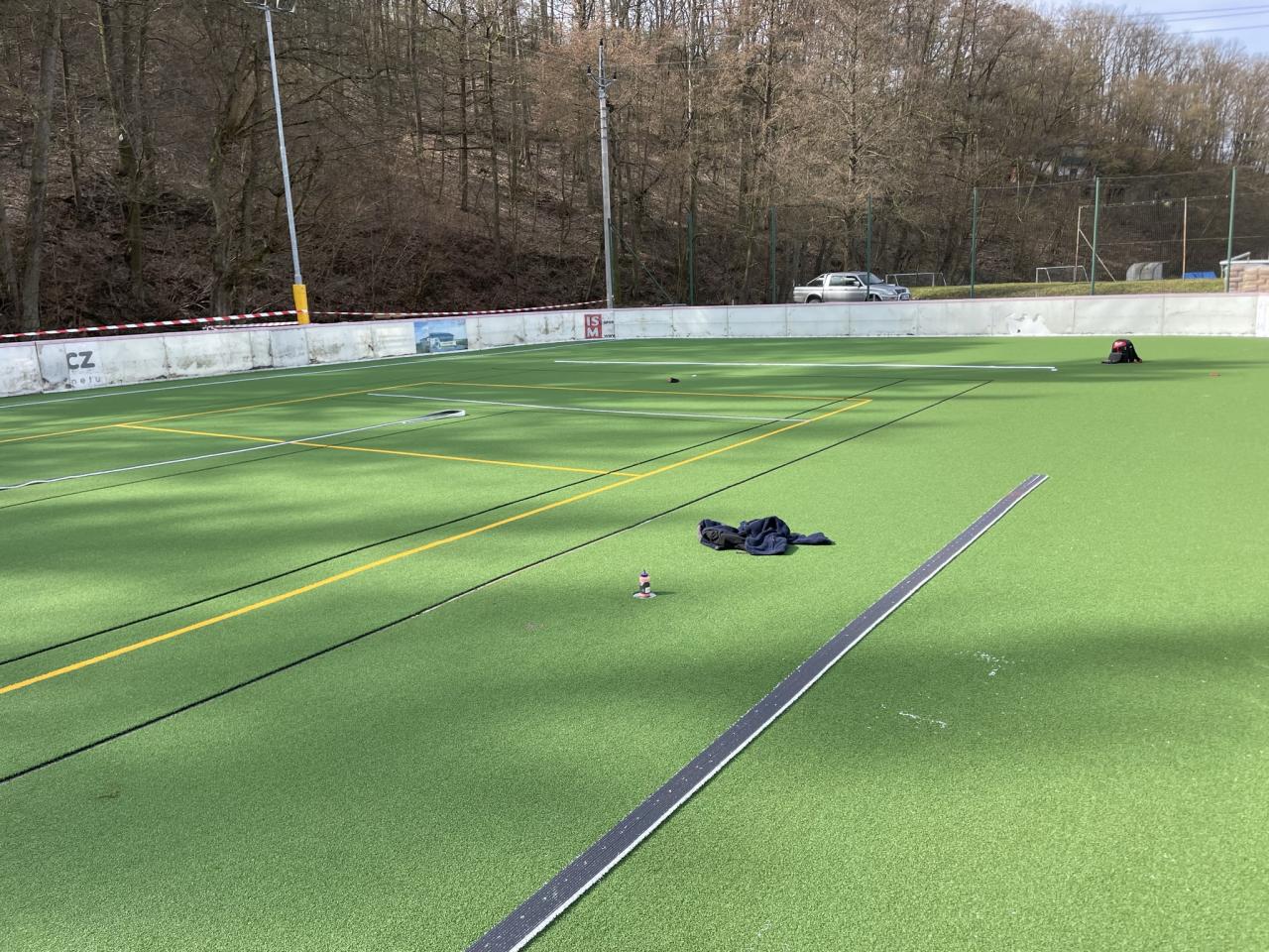 …na hřišti na Poňavě pokračují rychlým tempem. Na realizaci jsme získali dotaci od Národní sportovní agentury ve výši cca 500 tis. Kč, což je zhruba polovina nákladů. Není to tedy úplně nejlevnější záležitost, tak aby nám co nejdéle vydržela je potřeba dodržovat určitá pravidla. Vstup na umělou trávu je možný jen v turfech, sálovkách, nebo teniskách. Je přísně zakázáno vstupovat na tuto plochu v normálních kopačkách…
